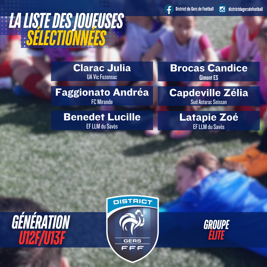 À la suite des 𝐝𝐞𝐮𝐱 𝐣𝐨𝐮𝐫𝐧𝐞́𝐞𝐬 𝐝𝐞 𝐝𝐢𝐚𝐠𝐧𝐨𝐬𝐭𝐢𝐜 𝐟𝐞́𝐦𝐢𝐧𝐢𝐧 organisées les 21 et 27 octobre derniers, le District du Gers de Football a le plaisir de dévoiler 𝐥𝐚 𝐜𝐨𝐦𝐩𝐨𝐬𝐢𝐭𝐢𝐨𝐧 𝐝𝐞𝐬 𝐠𝐫𝐨𝐮𝐩𝐞𝐬 𝐄́𝐥𝐢𝐭𝐞 𝐞𝐭 𝐃𝐞́𝐯𝐞𝐥𝐨𝐩𝐩𝐞𝐦𝐞𝐧𝐭 𝐩𝐨𝐮𝐫 𝐥𝐞𝐬 𝐜𝐚𝐭𝐞́𝐠𝐨𝐫𝐢𝐞𝐬 𝐔𝟏𝟐𝐅/𝐔𝟏𝟑𝐅 𝐞𝐭 𝐔𝟏𝟒𝐅/𝐔𝟏𝟓𝐅.
