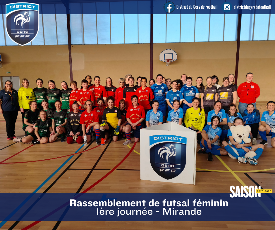 Dimanche 11 janvier 2026, s’est tenue la première journée de Futsal Senior Féminine sur les installations de la commune de Mirande, que le District du Gers de Football remercie chaleureusement pour son accueil et la qualité de ses infrastructures.