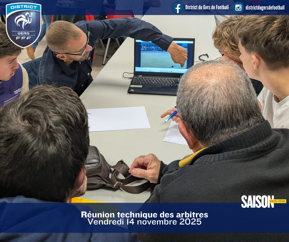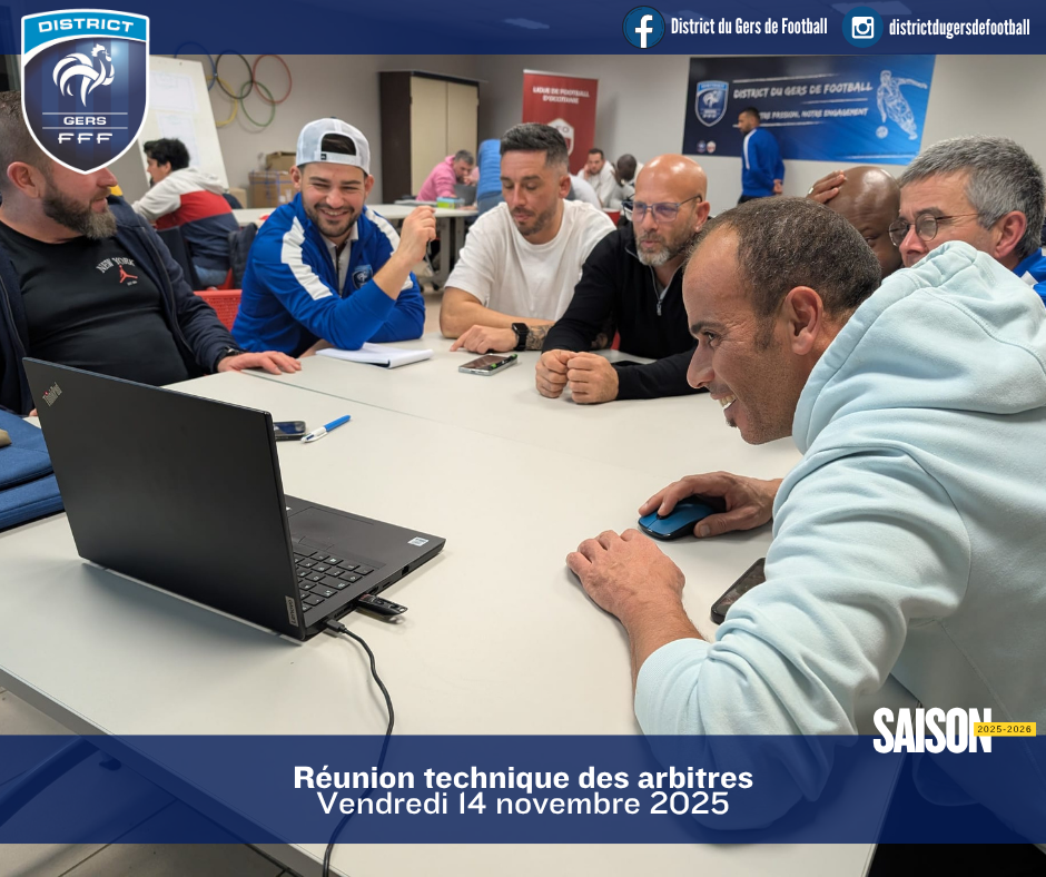 Vendredi 14 novembre 2025, les arbitres du District du Gers de Football se sont retrouvés pour leur première réunion technique de la saison, animée par le Conseiller Territorial en Arbitrage, Frédéric HEBRARD, accompagné de Sandrine REIGNAUD et Mourad SAHRI, membres de la Commission Départementale d’Arbitrage.