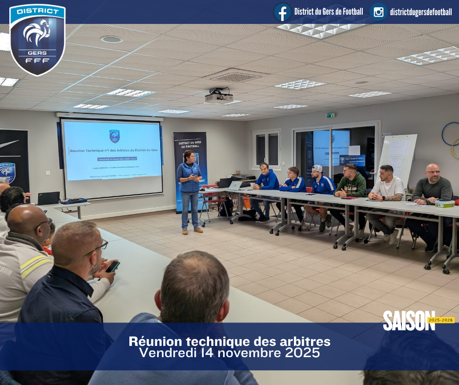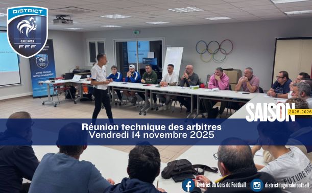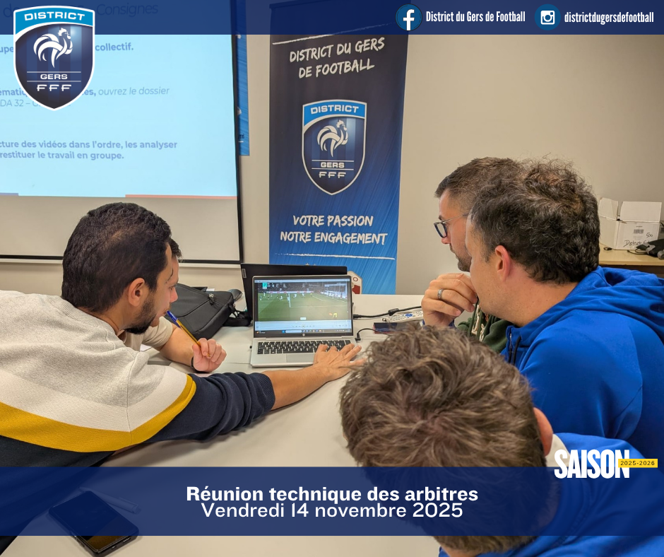 Vendredi 14 novembre 2025, les arbitres du District du Gers de Football se sont retrouvés pour leur première réunion technique de la saison, animée par le Conseiller Territorial en Arbitrage, Frédéric HEBRARD, accompagné de Sandrine REIGNAUD et Mourad SAHRI, membres de la Commission Départementale d’Arbitrage.